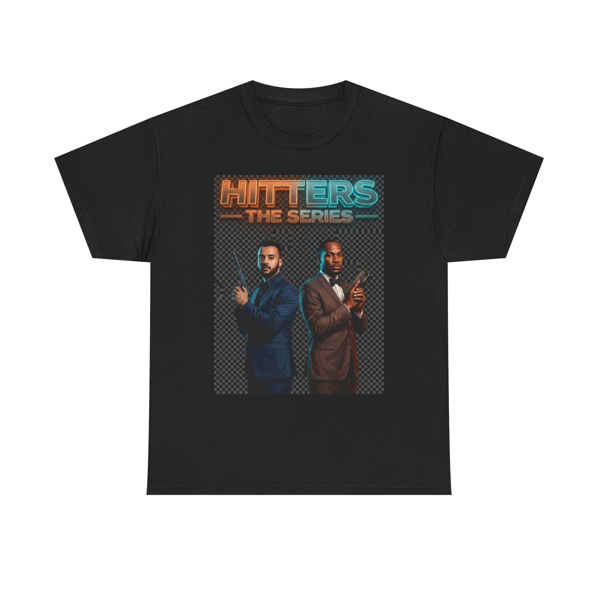 This classic crewneck tee brings a cinematic, retro-thriller vibe to everyday wear. The front print shows two suited figures back-to-back beneath a neon 'HITTERS — THE SERIES' title, giving the shirt a TV-poster energy that reads bold and nostalgic. Soft-feeling medium-weight cotton drapes cleanly; the ribbed collar and shoulder tape keep the shape through repeat wear. Wear it with jeans and a leather jacket for night outs, or layer under a blazer for a casual, character-driven look. It’s made and finished with attention to detail: tear-away label for comfort, tubular knit for a smooth silhouette, and a printing mix (DTF for sleeves/inner neck and DTG for main art) that preserves crisp color and detail.